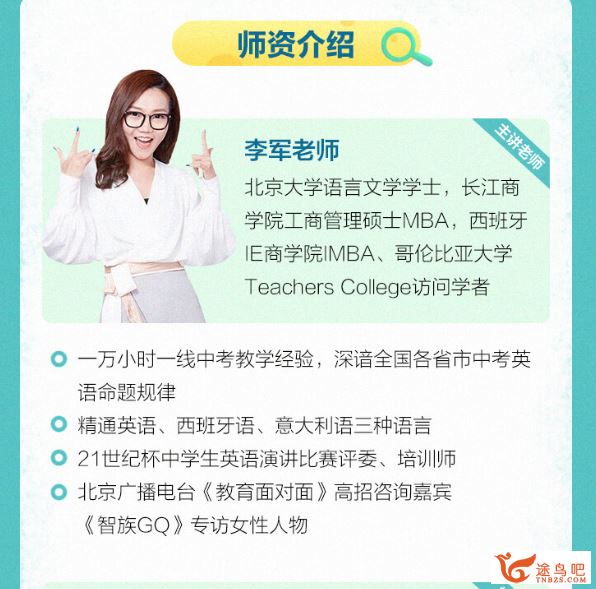 21世纪杯中学生英语演讲比赛评委、培训师。2019年,入驻在线教育机构跟谁学,现为跟谁学初中英语特约名师,开设中学英语系列线上课程。