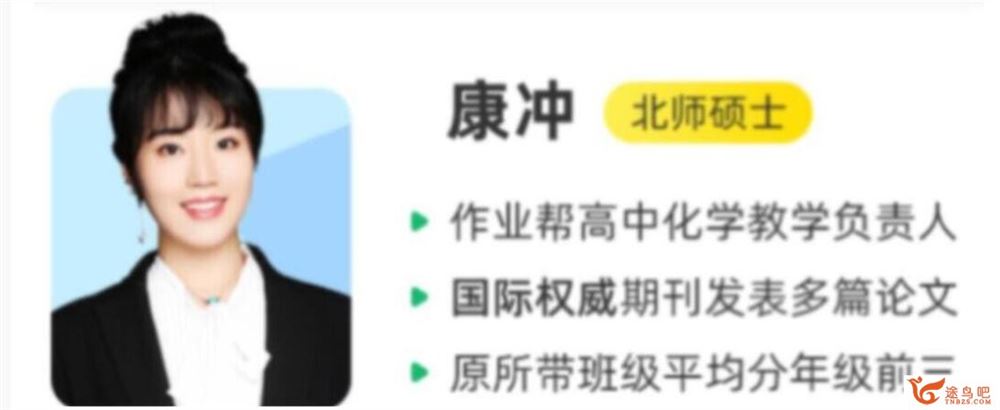 康冲老师,北京师范大学硕士,作业帮“简化学”教学体系创始人,参与教辅用书编写;被授予“作业帮**价值培训师′荣誉称号。硬核化学,讲解清晰,北京师范大学研究生,中科院科研深造,在国际权威期刊发表全英文学术论文多篇。5·3编委,更懂高考规律,《五年高考,三年模拟》副主编,《敲重点》系列丛书主编,《巧妙攻破方程式书写》主编。作业帮“简化学”大招体系创始人。温暖有趣,简单高效。教育部课程评选——优秀成果奖作业帮**价值培训师。