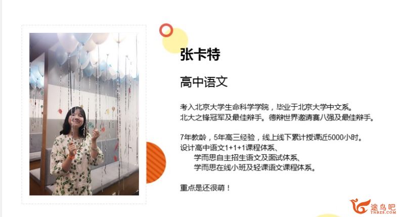 7年教龄,5年高三经验,线上线下累计授课近5000小时。设计高中语文1+1+1课程体系、