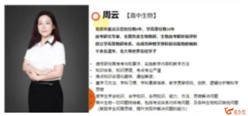 教师简介 教师资质:20191100142004559 16年教学经验,北京市重点示范校任教6年,学而思任教10年,高中生物问题终结者;培养千余名清华、北大等世界名校学子,创立学而思生物教研体系; ...
