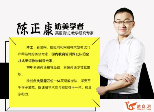 陈正康老师 博士,访美学者,英语测试学和英语教学研究专家。 新浪网、**网和网易等大型考试门户网站,特约访谈专家,国内教育培训界公认的全才式英语教学辅导专家。 10年考研英语辅导经...