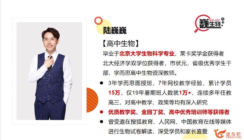 [初中生物]陆巍巍 新初二科学年卡尖子班生物篇(浙教版) 19讲 百度网盘分享 名师简介: 陆巍巍,男,出生于1990年。2009年毕业于新疆农七师高级中学, 同年进入北京大学生命科学学院学...