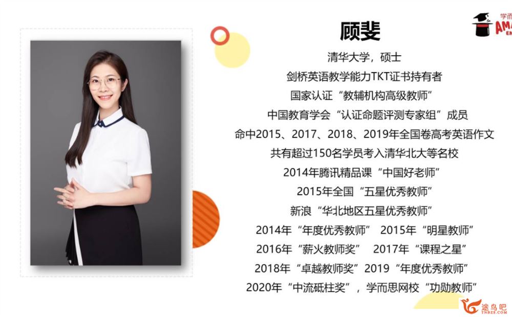 名师简介: 教师简介:顾斐 顾斐,2012年毕业于清华大学。求学期间,兼任高中英语教师, 2013年7月加入学而思网校, 建立了高中完善的英语课程体系并确定了目前学而思网校高中部英语学...